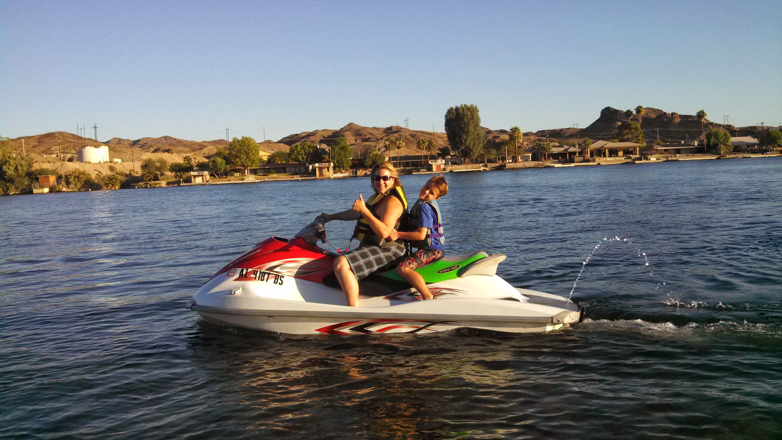 We are back where we started. We came back to get things worked on the R.V. When we came back it was around the time of our birthday, so we got to celebrate it with family, which was great. Then we went to Earp, California. We were technically still in California. The other side was Arizona you had to cross the Colorado River to get over there. We got go jet skiing on the Colorado River, it was awesome, when we were returning them my Daddy, my brother, and I fell in the water. I fell in the Colorado River! After that we went to Grand Canyon National Park. The Grand Canyon is so beautiful. God is amazing! On our way to our next stop! We stopped at Flinstone Park! That was fun! I kept on getting stickers on my foot!