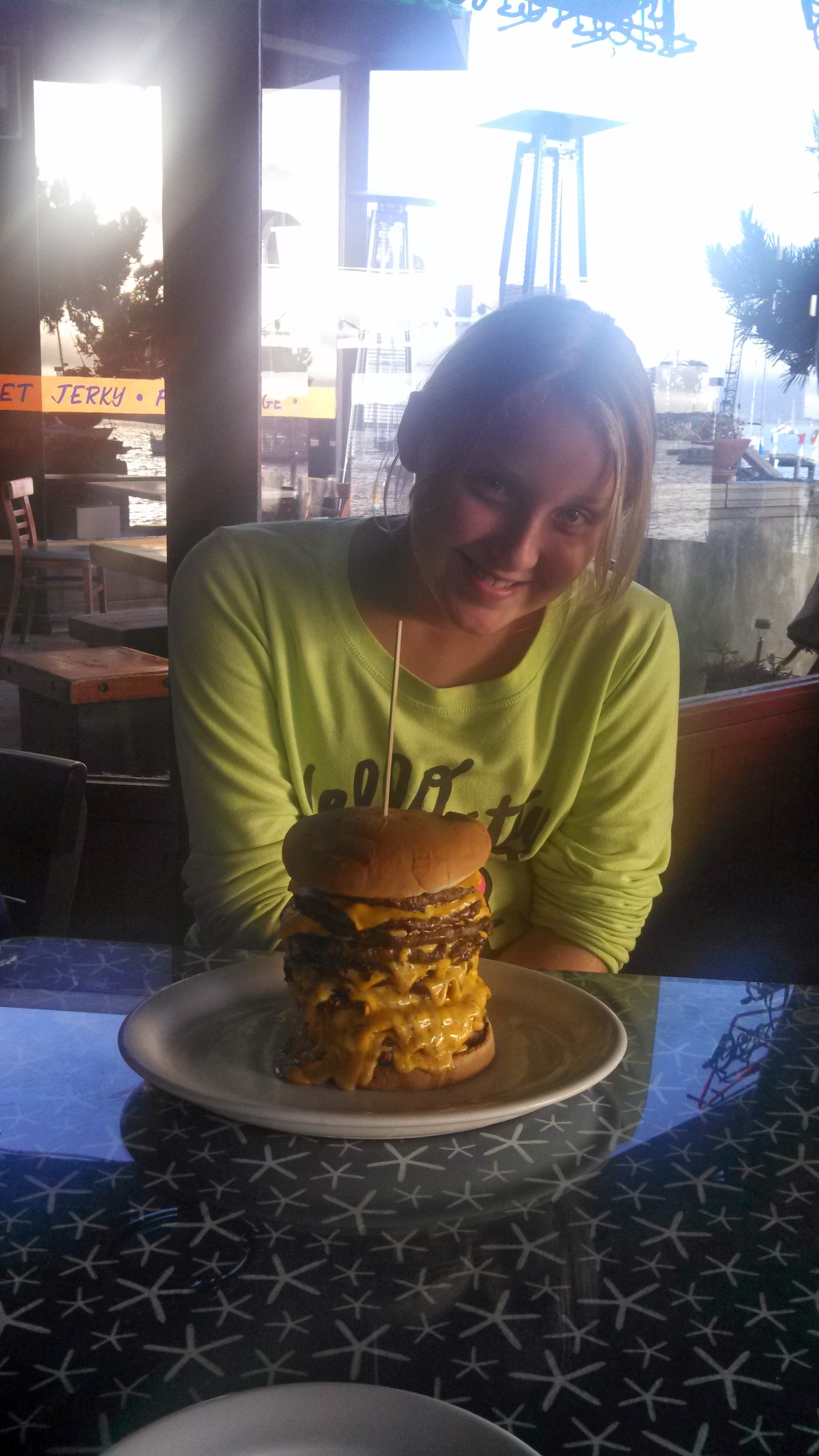 Hope taking the 12 hamburger patty eating challenge in Morro Bay!